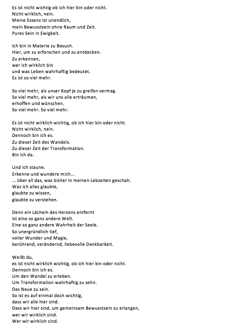 Es ist nicht wichtig, ob ich hier bin… Verfasst vonLiviaJuli 29, 2022Veröffentlicht inAllgemeinSchlagwörter:Bewusstseinswandel, Selbsterkenntnis, Transformation Teilen mit: Auf Facebook teilen (Wird in neuem Fenster geöffnet) Facebook Auf Telegram teilen (Wird in neuem Fenster geöffnet) Telegram Auf WhatsApp teilen (Wird in neuem Fenster geöffnet) WhatsApp Email a link to a friend (Wird in neuem Fenster geöffnet) E-Mail Ähnliche Beiträge