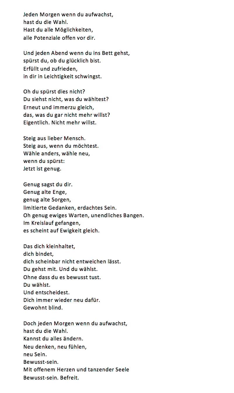 Jeden Morgen hast du die Wahl Verfasst vonLiviaMärz 18, 2023Veröffentlicht inAllgemeinSchlagwörter:Spiritueller Weg Teilen mit: Auf Facebook teilen (Wird in neuem Fenster geöffnet) Facebook Auf Telegram teilen (Wird in neuem Fenster geöffnet) Telegram Auf WhatsApp teilen (Wird in neuem Fenster geöffnet) WhatsApp Email a link to a friend (Wird in neuem Fenster geöffnet) E-Mail Ähnliche Beiträge