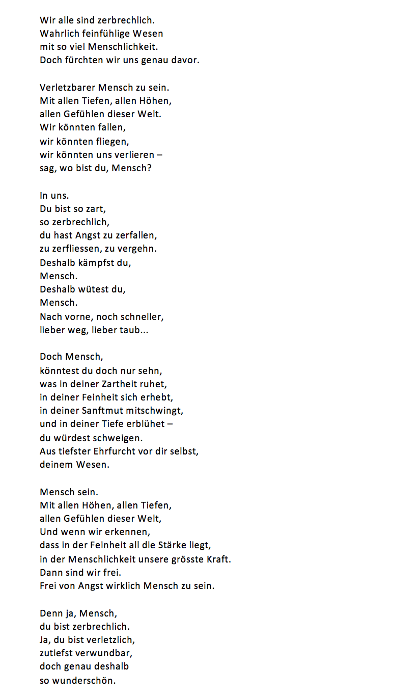 Zerbrechlich Verfasst vonLiviaSeptember 10, 2023Veröffentlicht inBewusstseinswandel, HerzenswegSchlagwörter:Feinfühligkeit, Menschlichkeit, Sensibilität, Verletzlichkeit Teilen mit: Auf Facebook teilen (Wird in neuem Fenster geöffnet) Facebook Auf Telegram teilen (Wird in neuem Fenster geöffnet) Telegram Auf WhatsApp teilen (Wird in neuem Fenster geöffnet) WhatsApp Email a link to a friend (Wird in neuem Fenster geöffnet) E-Mail Ähnliche Beiträge