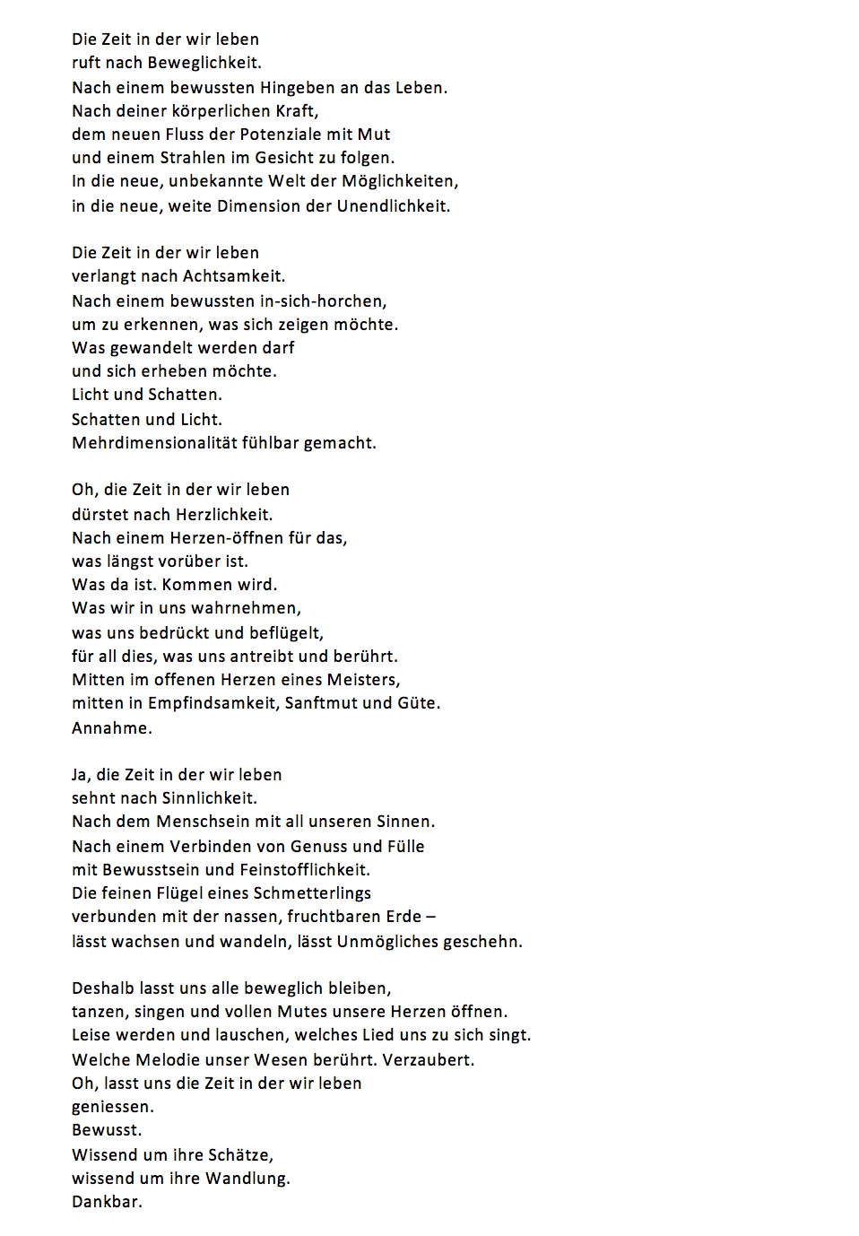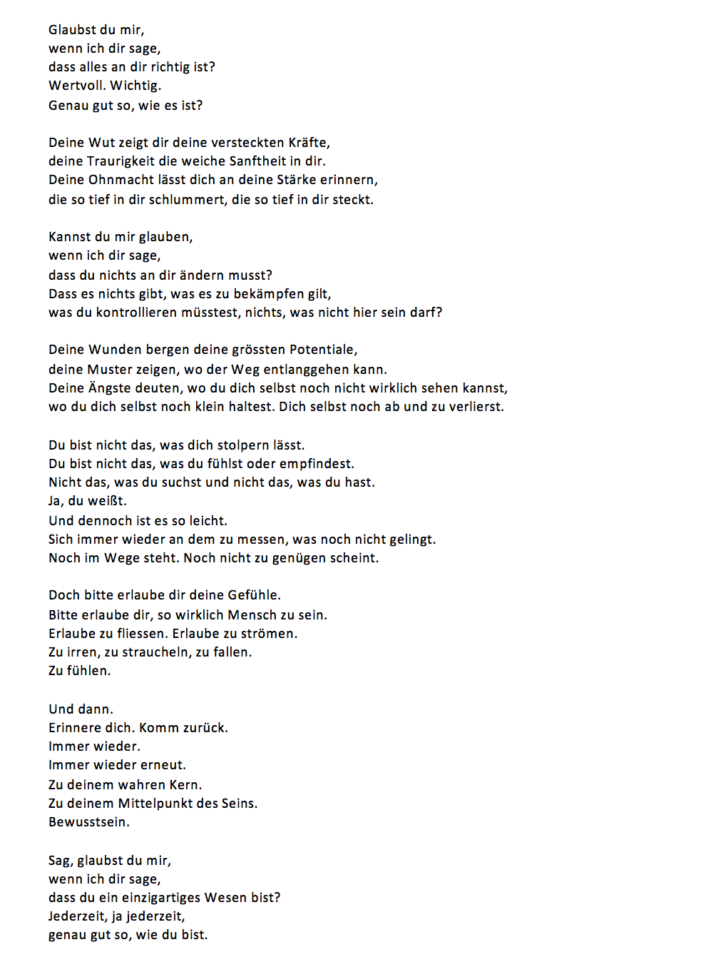 „Ich habe die letzten Monate gemerkt, wie sehr ich mich immer wieder verliere, wenn ich mich in die Zukunft richte und auch wenn ich an mir arbeite. Dabei kommt alles zu mir, wenn ich mich vertrauensvoll dem Leben öffnen kann. Es braucht unglaublich viel Mut, das ist nicht zu leugnen, doch das ist es mir wert, weil ich dadurch auch zu mir selbst viel Nähe aufbaue.