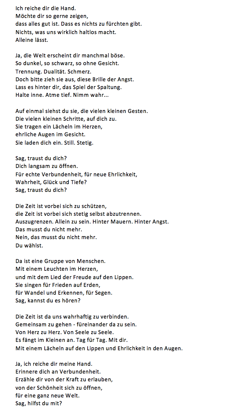 Aber um deine Frage konkret zu beantworten: Ich denke nicht mehr in dieser linearen Abfolge von Vergangenheit und Zukunft. Ich plane nicht mehr. Als ich damals erkannt habe, dass meine eigene Geschichte nur dazu diente, mich zu dem einen Punkt zu bringen, wo ich erkennen durfte, dass alles eine Illusion war, von dem Zeitpunkt an war ich frei. Frei im Jetzt zu sein und immer das zu wählen, was wahrlich zu mir singt. Somit brauche ich keine Pläne oder Wünsche. Ich tue einfach das, was mir in meinem Sein Freude, Frieden und Erfüllung bringt. Ich folge dem, was in mir klingt.“