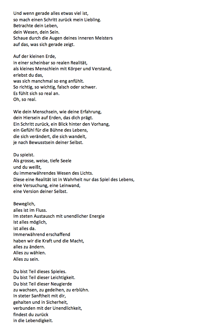„Deine Präsenz in dir selbst entscheidet darüber, wie sehr du im inneren Gleichgewicht sein kannst. Aus dieser inneren Mitte heraus kannst du viel eher ein Leuchtturm für sie sein, als wenn du mit ihr mitschwingst. Einzig den Kick vom Drama musst du vergessen können, denn den gibt es dann nicht mehr.“